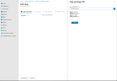 You will need to use the Microsoft Win32 Content Prep Tool to prepare the installer for deployment. Go to the following link to download the Source code (.zip) file, and then place it in the Intune folder: https://github.com/microsoft/Microsoft-Win32-Content-Prep-Tool