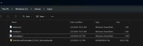 Copy the msixbundle, install.ps1, uninstall.ps1, and detect.ps1 files into the Input folder. You should now have:
